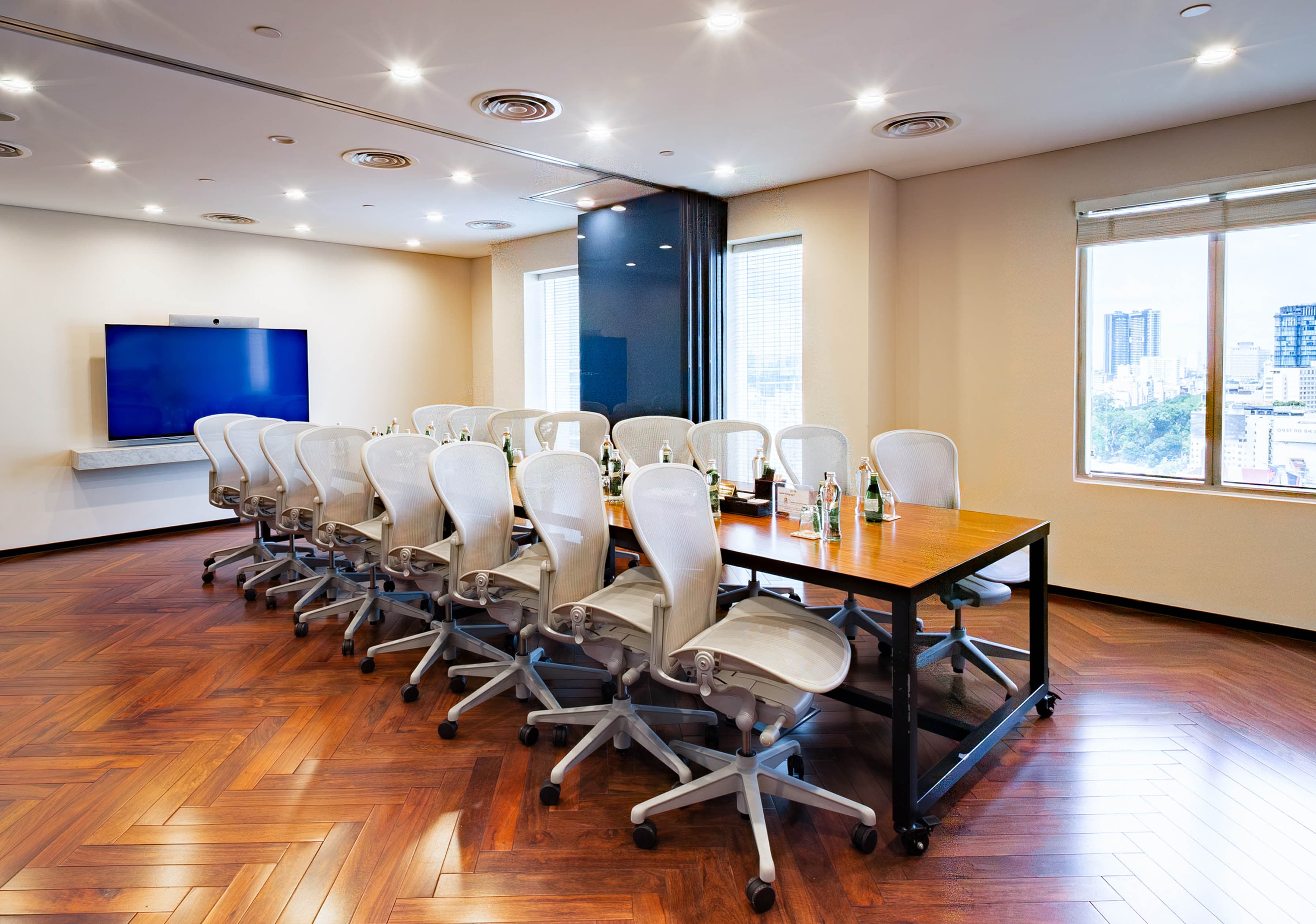 我们的现代化会议室能用于举行各种不同的会议。我们可以为您量身定制空间的布局和品牌建设,以适合您的活动。会议室的良好隔音效果和电子雾化玻璃可确保隐私,与此同时,高速 Wi-Fi、视听技术和现场支持团队可确保会议顺利进行。